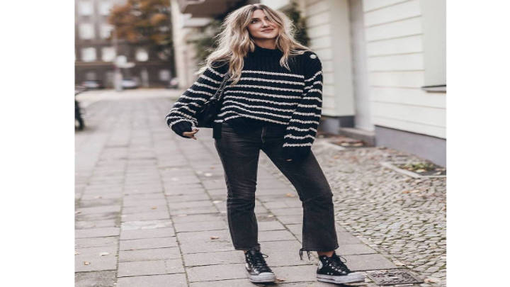 Sin que todas las prendas sean de negro liso, introduce una nota diversa con prints minimalistas al estilo marinero; así es como terminas el cuadro con unos jeans y unas zapatillas mujer; además de poder crear tendencia por tener un estilo muy personal a la hora de vestir.